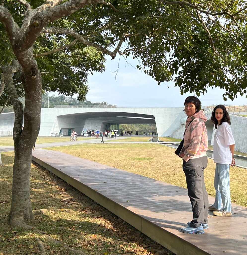 Llegamos al Xiangshan Visitor Center. centro de visitantes en el lado oeste del lago que abre. Su arquitectura original es obra del arquitecto japonés Norihiko Dan, Mezcla la armonía entre la naturaleza y el ser humano (o eso elucubró el señor Dan). Dentro hay oficinas de información, administrativas, alguna exposición, una cafetería, una terraza con vistas, etc.
