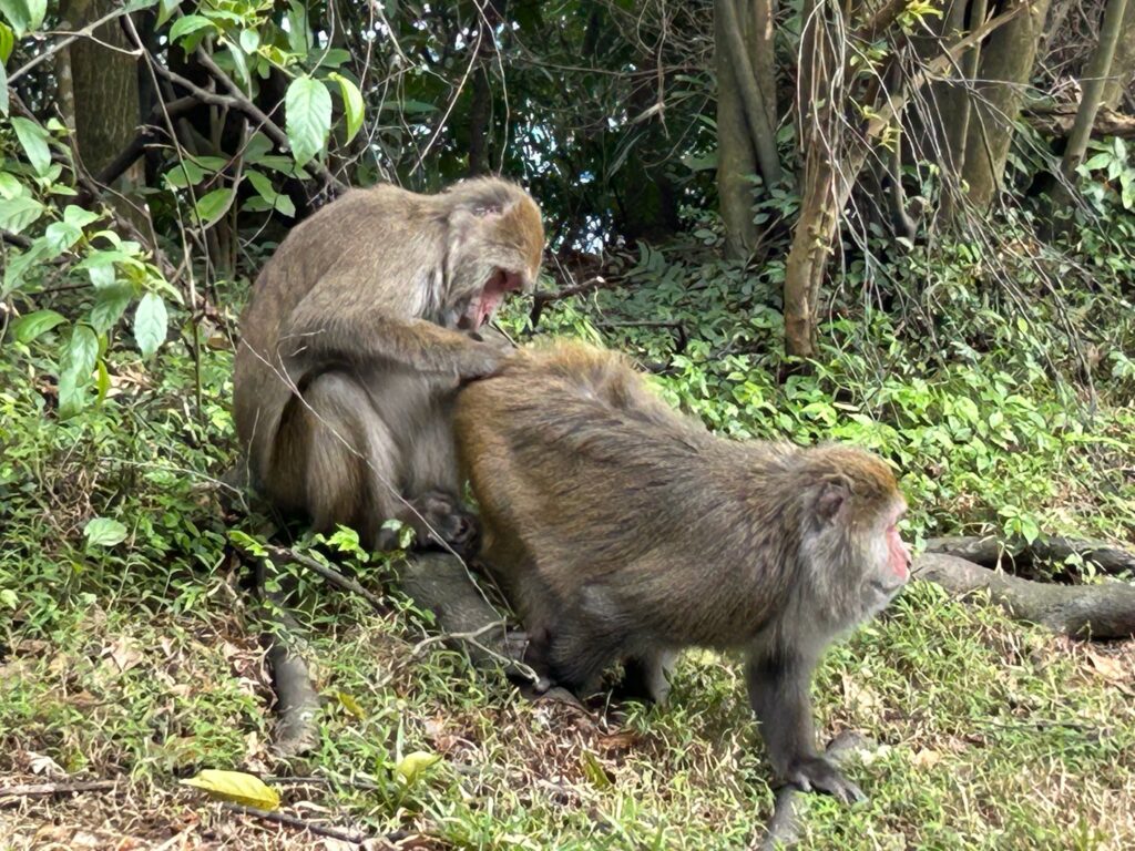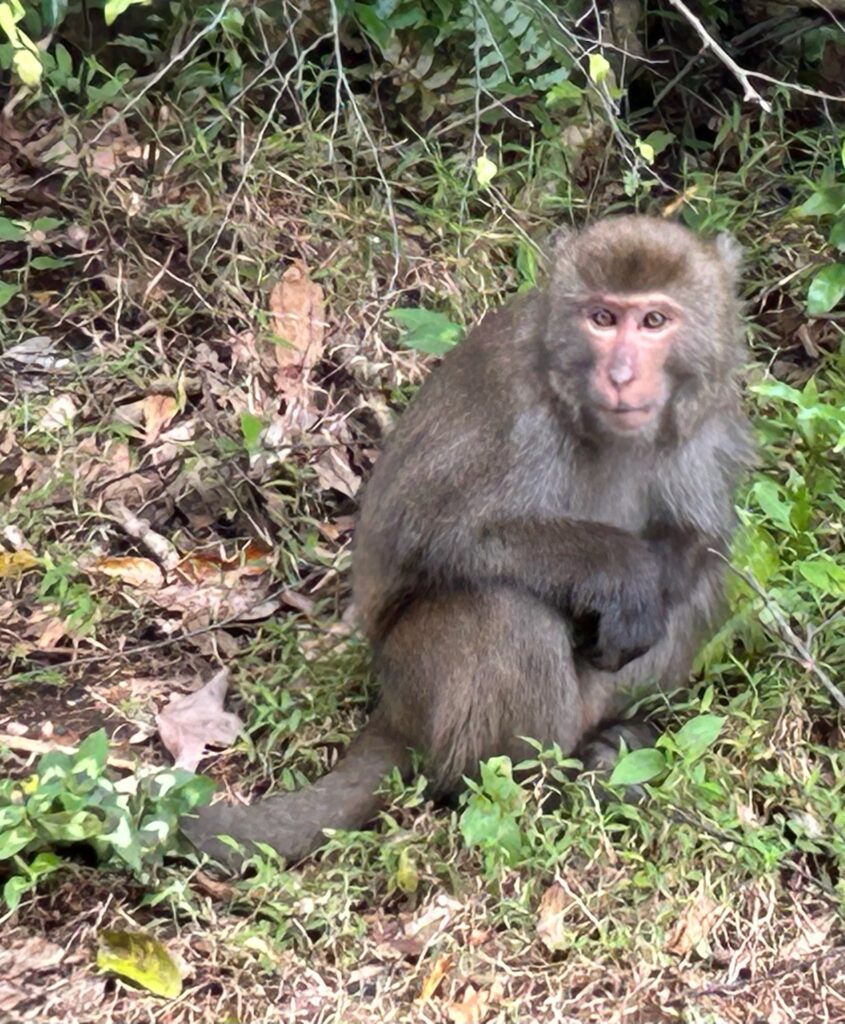 Nos sorprenden 3 monos (macacos de Formosa) en la misma cuneta de la carretera bastante impertérritos:
